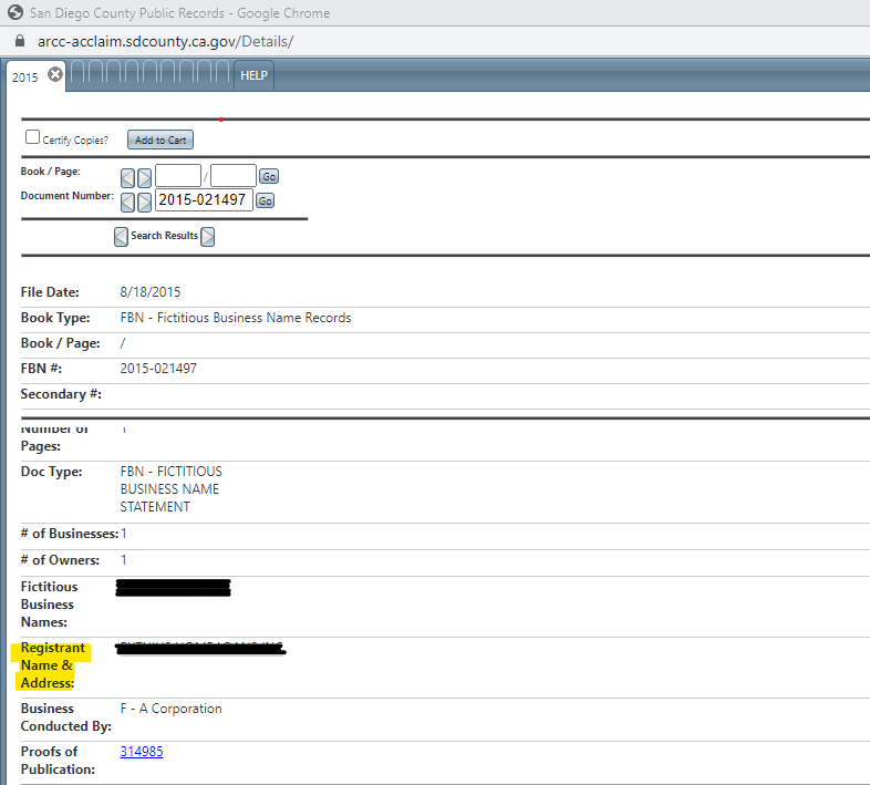 6. If the owner is a corporation or LLC (normally ends in "corp", "inc." or "LLC"), you will want to review the section on searching the California Secretary of State's database listed above.